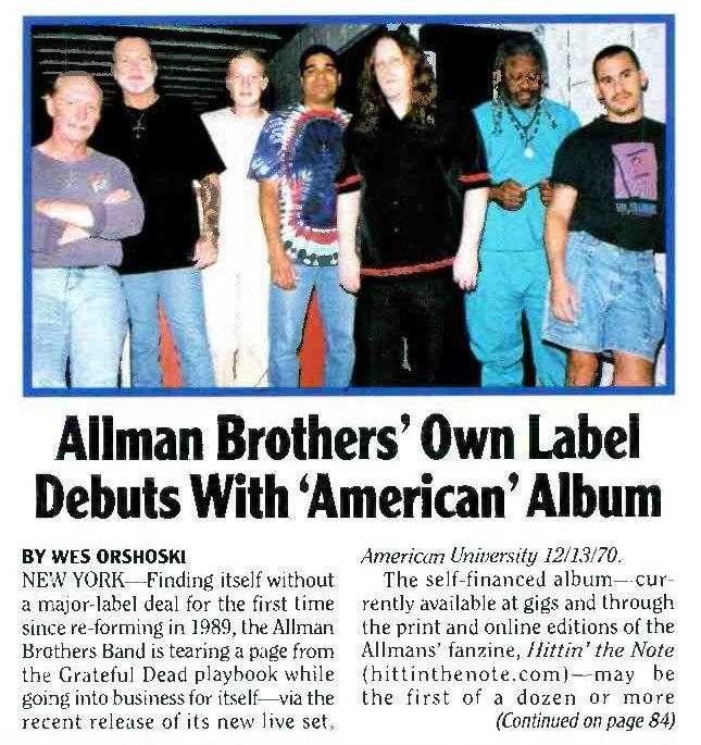 WES ORSHOSKI: Allman Brothers' Own Label Debuts With 'American' Album (first published in 'Billboard', April 20, 2002)