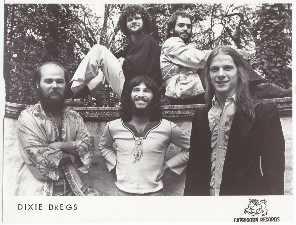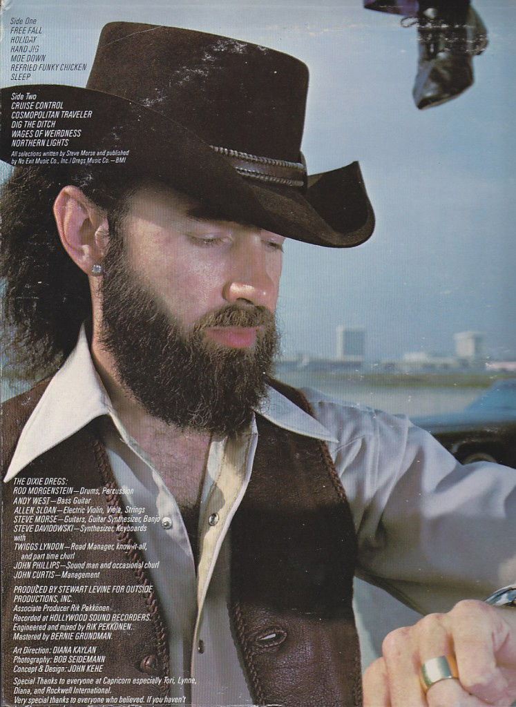 In 1976 Steve Morse, a music student at the University of Miami, and some friends recorded a self-financed album called The Great Spectacular. Naming themselves the Dixie Dregs, Morse and bandmates moved to Augusta, Georgia. “We began blitzing the record companies with demos,” Morse told me in 1978. “People said, ‘Wow, that’s a weird band,’ but nobody was willing to do anything with it because it was instrumental music.” Then, Morse continues, “around Christmas 1976, we got on a gig with Sea Level in Nashville, and freaked out Chuck Leavell and Twiggs Lyndon. So when we finished playing, I talked to Twiggs about working for us. I was feeling sort of depressed because I knew we couldn’t afford him, but he said, in short, that he’d work for nothing, or whatever we could give him. The next day Chuck and Twiggs called up Phil Walden at Capricorn Records and gave him a big pep talk about the band. Phil agreed to do a personal audition, so we played on the floor of a disco club in Macon, Georgia. He said, ‘Okay, we’ll do it.’ We got the contracts together and signed.” In addition to serving as Dixie Dregs’ road manager, Lyndon became a mentor to the young musicians. His photo appeared on the back cover of the Dixie Dregs’ debut album, Freefall.