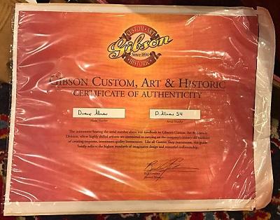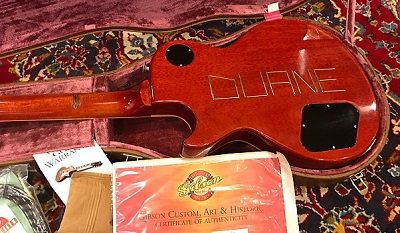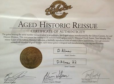 Source: Tony Bacon: "Sunburst", Backbeat Books, 2014. Page 68: The tobacco-finish guitar was the basis for a Gibson Custom Shop recreation in 2003, the Duane Allman 1959 Les Paul, in Aged finish. Page 133: Distinguishing features: - Grover Rotomatic tuners with metal kidney-bean buttons - 'Ribbon' or 'gullwing' flame on aged-finish maple top - "DUANE" spelled out in fret wire on body rear - Two BurstBucker pickups Production & serial numbers: - Nashville Custom Shop, limited edition of 55 - 55 Aged by Tom Murphy, serial-numbered with "DALLMAN" prefix General info: - Re-creation of Allman's darkburst Les Paul, known as Hot 'Lanta, which is now at the Rock & Roll Hall of Fame & Museum in Cleveland, Ohio, on loan from Allman's daughter Galadrielle - Despite the name of Gibson's re-creation, Allman's original guitar has no serial number and so cannot be dated to a single production year. |